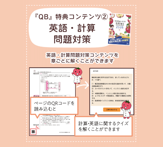 『QB2026』の特典コンテンツは、電子版『QB管理栄養士』と計算・英語問題対策用の○×クイズです。