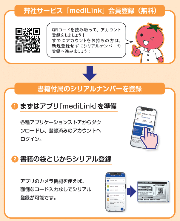 特典コンテンツを利用するためには、「mediLink」会員登録(無料)と書籍付属のシリアルナンバーの登録が必要です。OSごとの利用方法については下記リンク先をご参照ください。