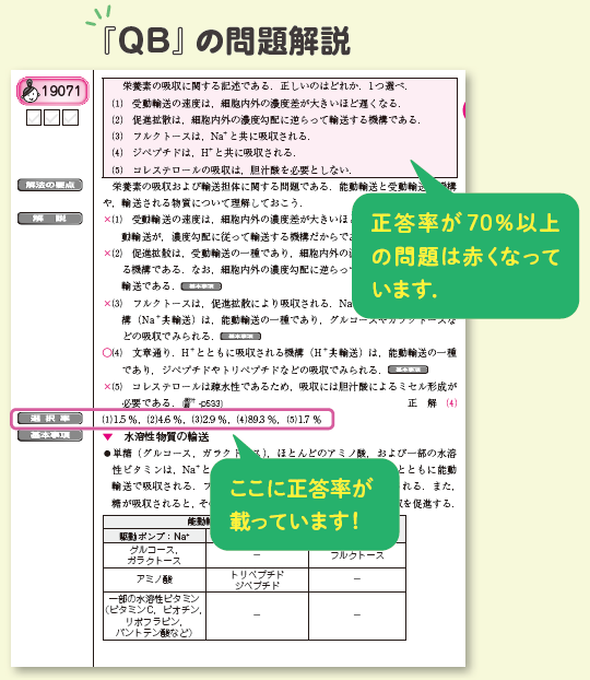 『QB』では問題ごとに正答率(選択率)を掲載しています.正答率が高い問題を間違えた場合は,本番で絶対に落とさないようにしっかりと復習する必要があります.一方,正答率が20%未満など極端に低い場合は,残り時間に応じて,復習を飛ばして先に進んでもOKです.