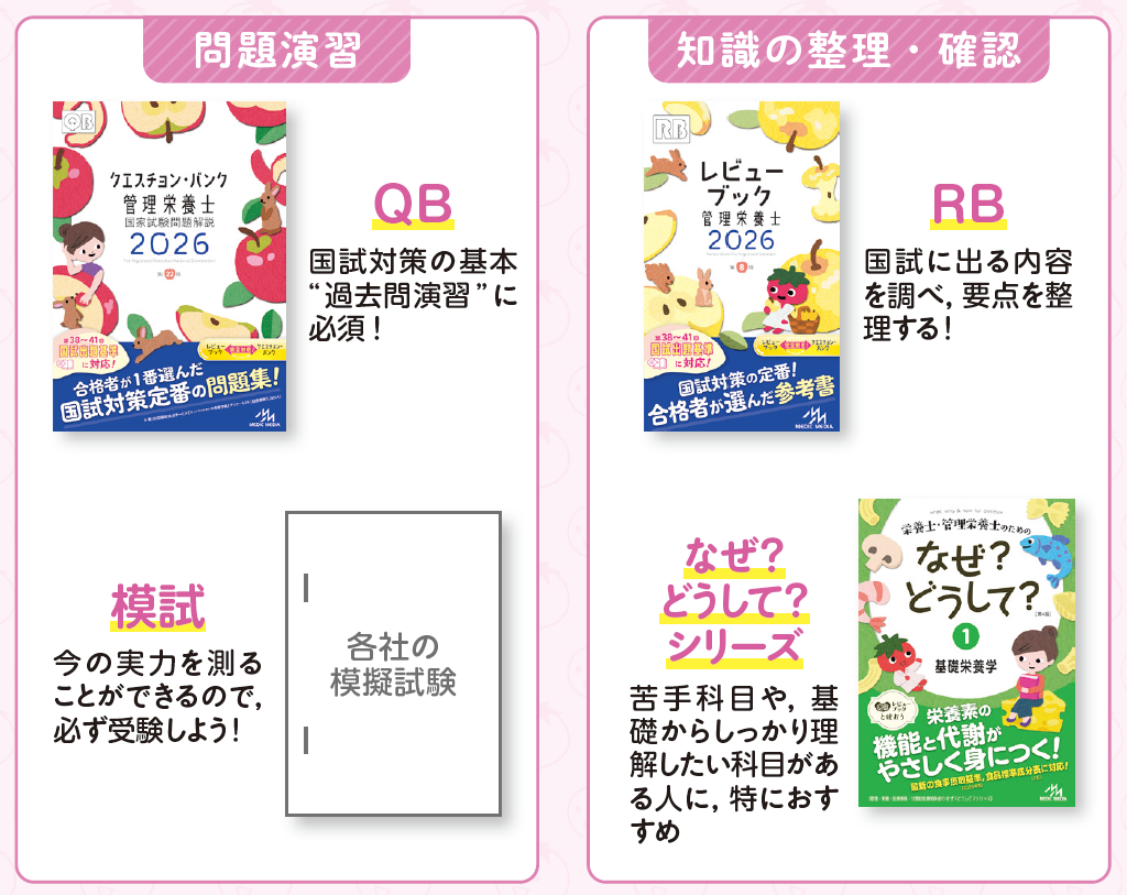 それらとあわせて,昨年も7割以上の受験生が選んだ『レビューブック』(以下RB)や,『なぜ?どうして?』(以下なぜ?)などの参考書を活用して,より効果的に国試対策を進めていきましょう!