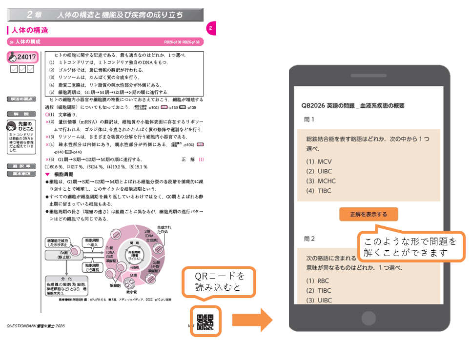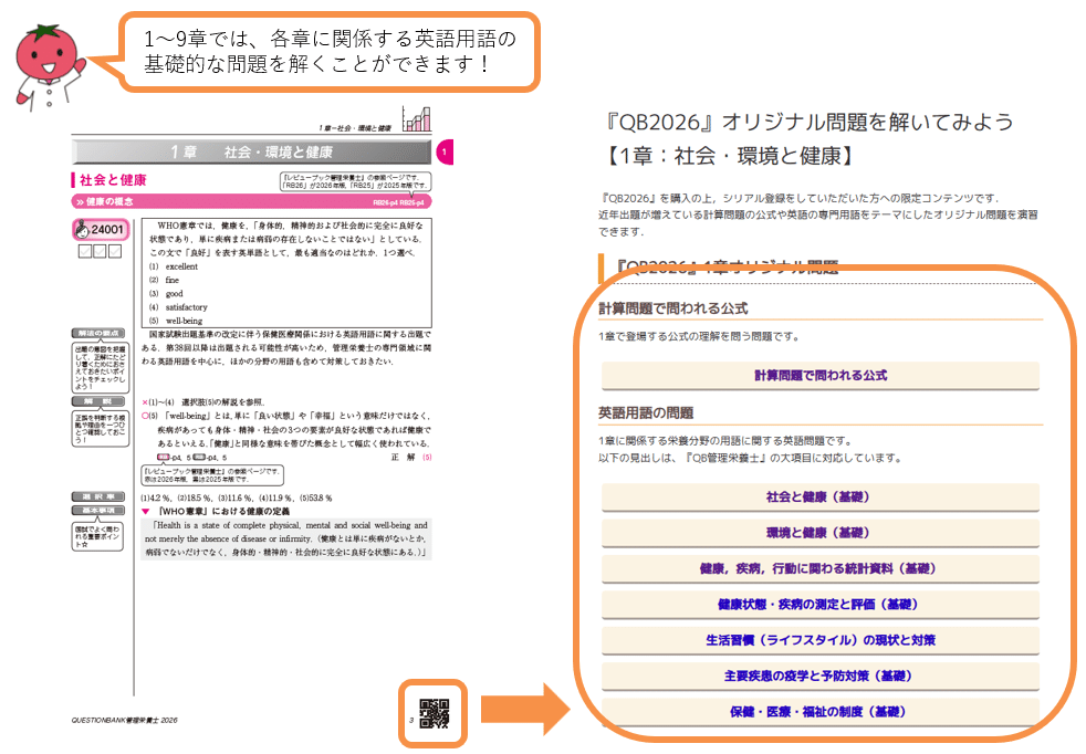 『クエスチョン・バンク管理栄養士2026』(『QB2026』)では、購入者限定コンテンツとして計算・英語用語に関するオリジナル問題が解けるようになっています。