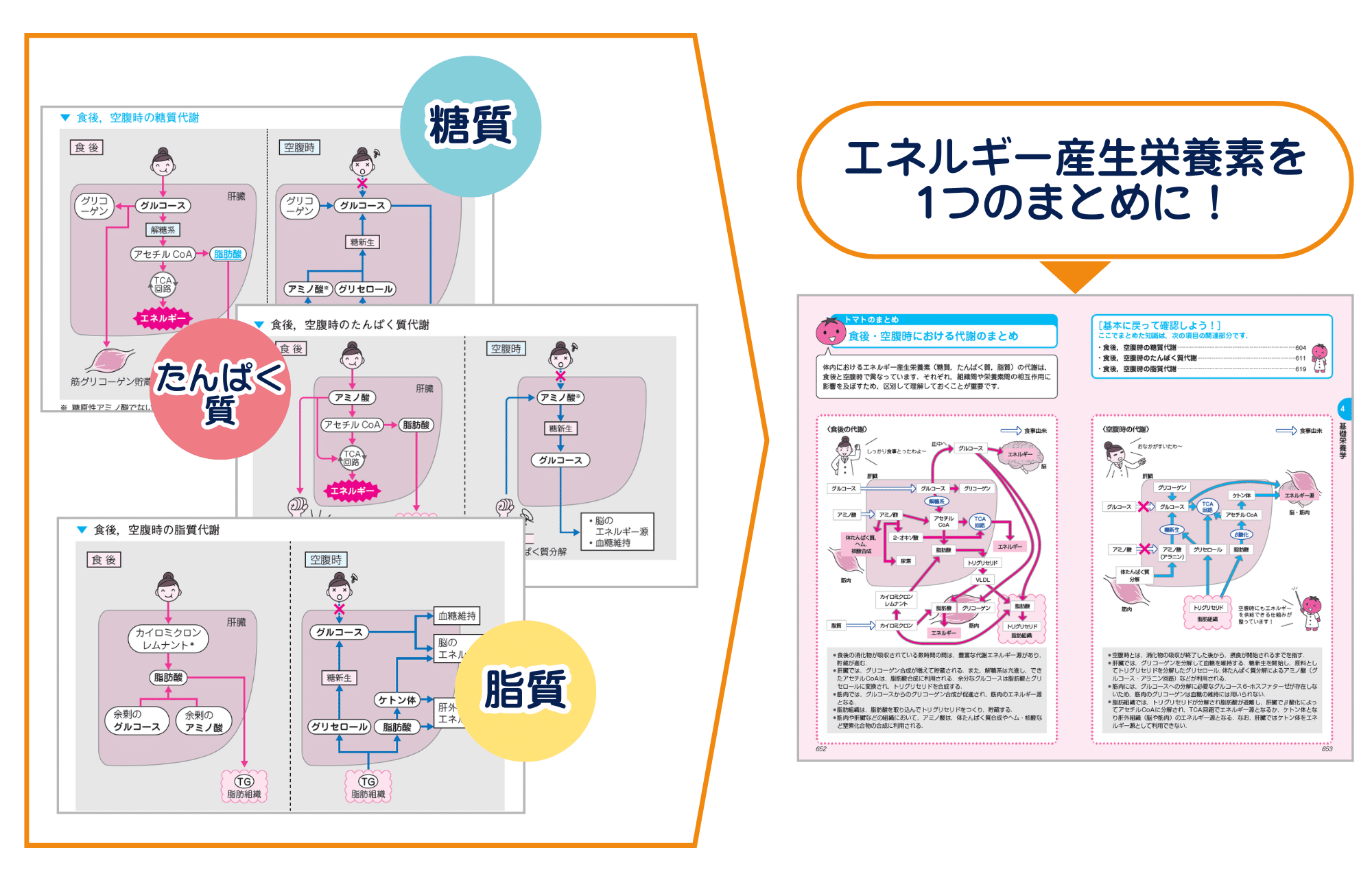 例えば、基礎栄養学で最も重要なテーマのひとつである、「食後・空腹時における糖質・たんぱく質・脂質それぞれの代謝」については,本文ではテーマ(栄養素)ごとに掲載しています。