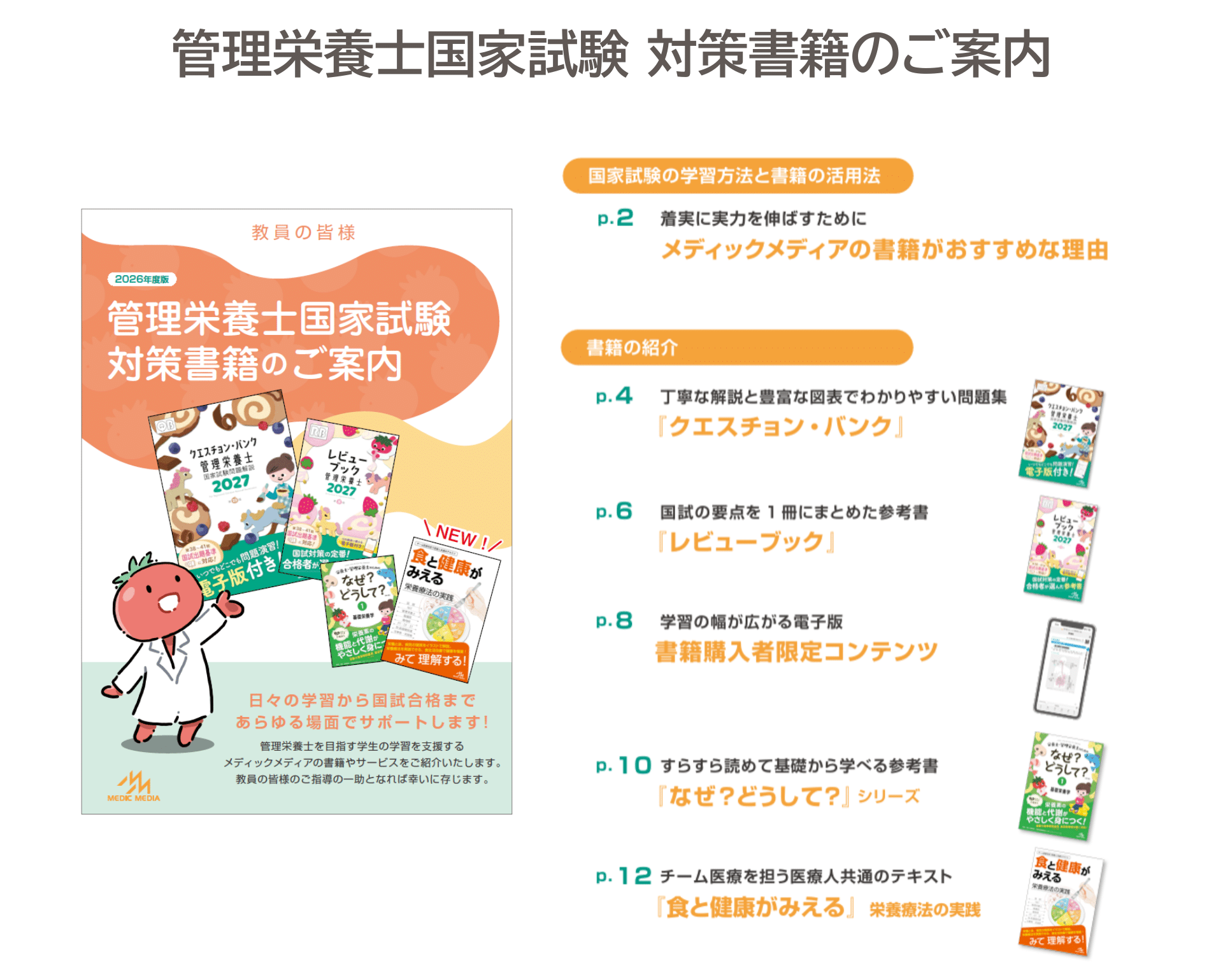 いつも弊社の教材をご活用いただき、誠にありがとうございます。 メディックメディアでは、管理栄養士養成施設における先生方の教育活動をサポートするため、最新の教材情報や指導用ツールをまとめた「教員向け採用パンフレット」を発行しております。